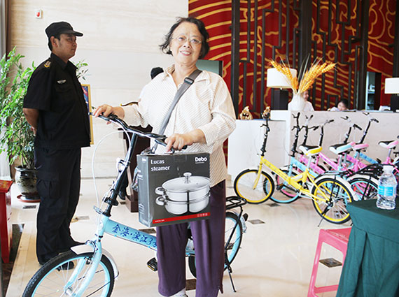 交完物業(yè)費的業(yè)主們在抽獎箱里抽取獎券,中獎率達到100%,喜得大獎的業(yè)主興高采烈。本次獎品有折疊自行車、大米、保溫杯、蒸鍋等,當天交費辦卡的業(yè)主都滿載而歸。一位中獎的業(yè)主說“到商場買東西經(jīng)常抽大獎,沒想到咱交物業(yè)費還能抽大獎,住在金海真的很幸福!”。