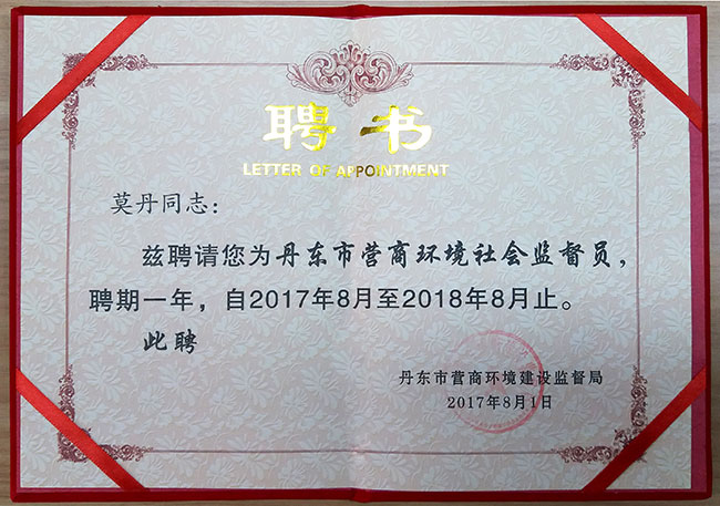 遼寧金海集團總經(jīng)理莫丹被聘請為丹東市營商環(huán)境社會監(jiān)督員