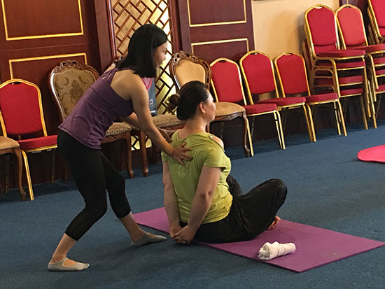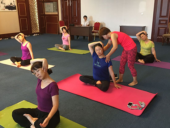 悄悄走近活動現(xiàn)場,金海大廈三樓大講堂里飄揚著舒緩的音樂,伴隨著輕柔的指導聲娓娓傳來,20多位業(yè)主們正在專業(yè)老師的帶領(lǐng)下學習瑜伽動作。