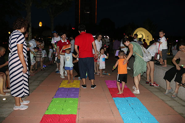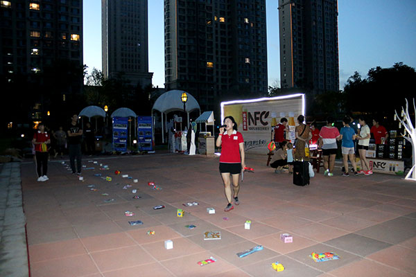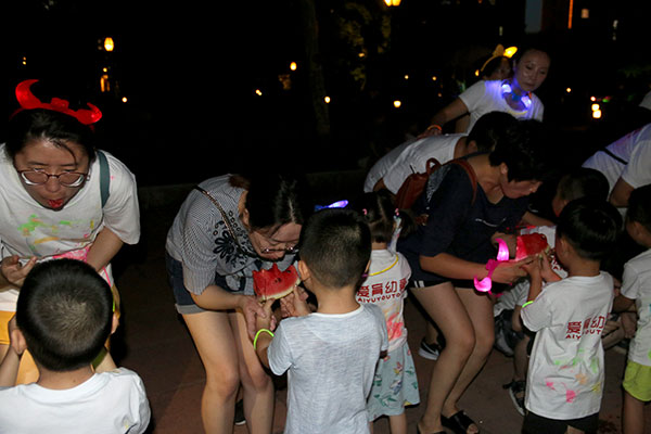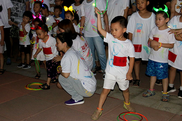 夜跑開始前進行了西瓜大作戰(zhàn)、瘋狂指壓板、夜光飛圈游戲活動,家長萌娃們一齊上陣,參與其中,歡聲笑語不斷地從濱江3號園區(qū)中傳來。