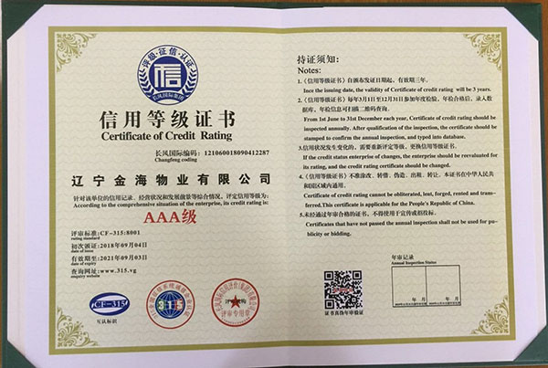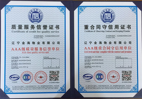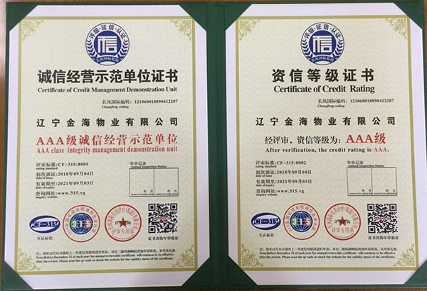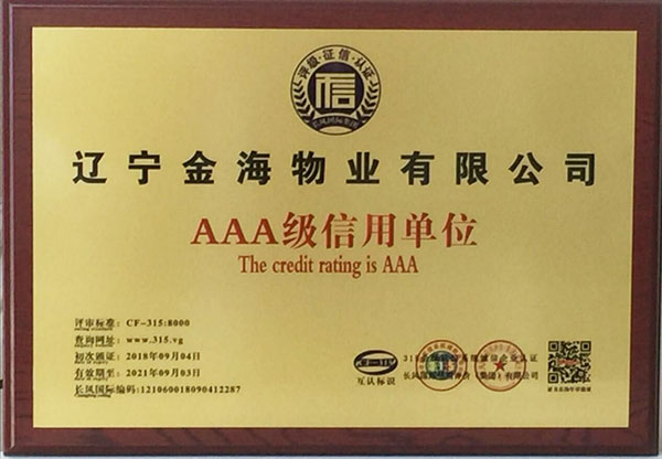 【AAA級(jí)信用企業(yè)資質(zhì)】是物業(yè)企業(yè)招投標(biāo)準(zhǔn)入必備的資質(zhì),為提升企業(yè)榮譽(yù)形象,增加投標(biāo)談判砝碼,擴(kuò)大金海物業(yè)在丹東市場(chǎng)的占有份額,物業(yè)總公司從8月中旬開始準(zhǔn)備相關(guān)申報(bào)材料,歷時(shí)半個(gè)月,于9月4日通過(guò)了AAA級(jí)全國(guó)信用等級(jí)的驗(yàn)證(可通過(guò)全國(guó)信用等級(jí)公示系統(tǒng)查詢http:www.315.vg),取得了AAA級(jí)信用單位、信用等級(jí)證書、質(zhì)量服務(wù)信譽(yù)證書、重合同守信用證書和誠(chéng)信經(jīng)營(yíng)示范單位證書,為金海物業(yè)在物業(yè)管理行業(yè)方面提高了核心竟?fàn)幜Α?/span>