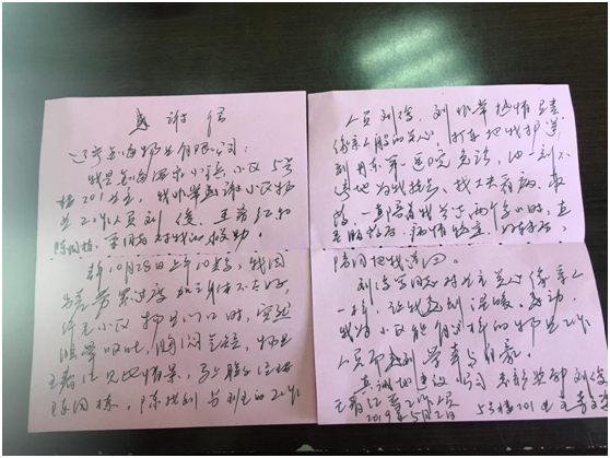 劉俊等同志對業(yè)主關(guān)系像親人一樣,讓我感到溫暖和感動,我為小區(qū)能有這樣的物業(yè)工作人員而感到幸運和自豪,真誠地建議公司表彰獎勵劉俊、王春紅等工作人員。