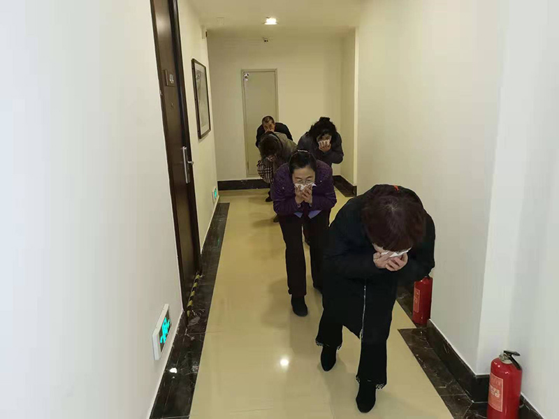 演練模擬金海度假公寓408房間,值班人員發(fā)現(xiàn)火情,立即進(jìn)行上報(bào),同時(shí)迅速撥打“119”報(bào)警。消控室人員將報(bào)警系統(tǒng)調(diào)制成自動(dòng)狀態(tài),按滅火,疏散應(yīng)急預(yù)案執(zhí)行。指揮組、滅火組、疏散組、救護(hù)組等成員按照分工,有條不紊地切斷非消防電源、啟動(dòng)消防泵、電梯迫降,疏散人員。