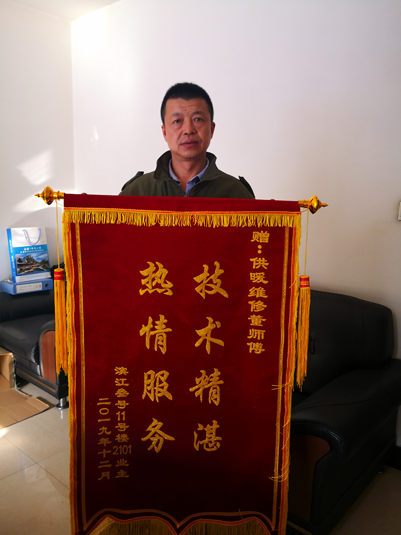 業(yè)主說由于該管道在供暖初期時(shí)出現(xiàn)滲水,自己在外面找來水暖工維修,更換過一段PPR管道,維修后地?zé)峋筒粺崃?。此次董彬判斷?zhǔn)確并一次維修成功,業(yè)主對(duì)董彬的維修技術(shù)特別滿意。為表示感謝,業(yè)主提出給董彬煙和維修費(fèi)用,都被董彬拒絕了。董彬說:“這就是順手的事,不用那么客氣,家中暖和了就好。”事后,該業(yè)主為表達(dá)謝意,特制作了錦旗一面送到春風(fēng)熱力公司。