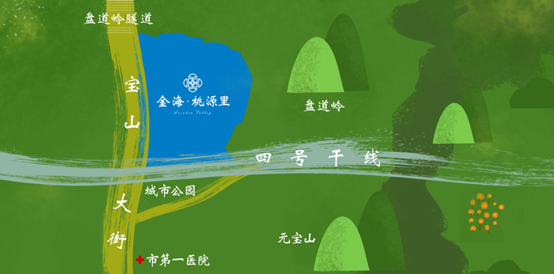 金海桃源里,位于八道溝虎躍汽車(chē)公司周邊地塊,三面環(huán)山,資源得天獨(dú)厚。