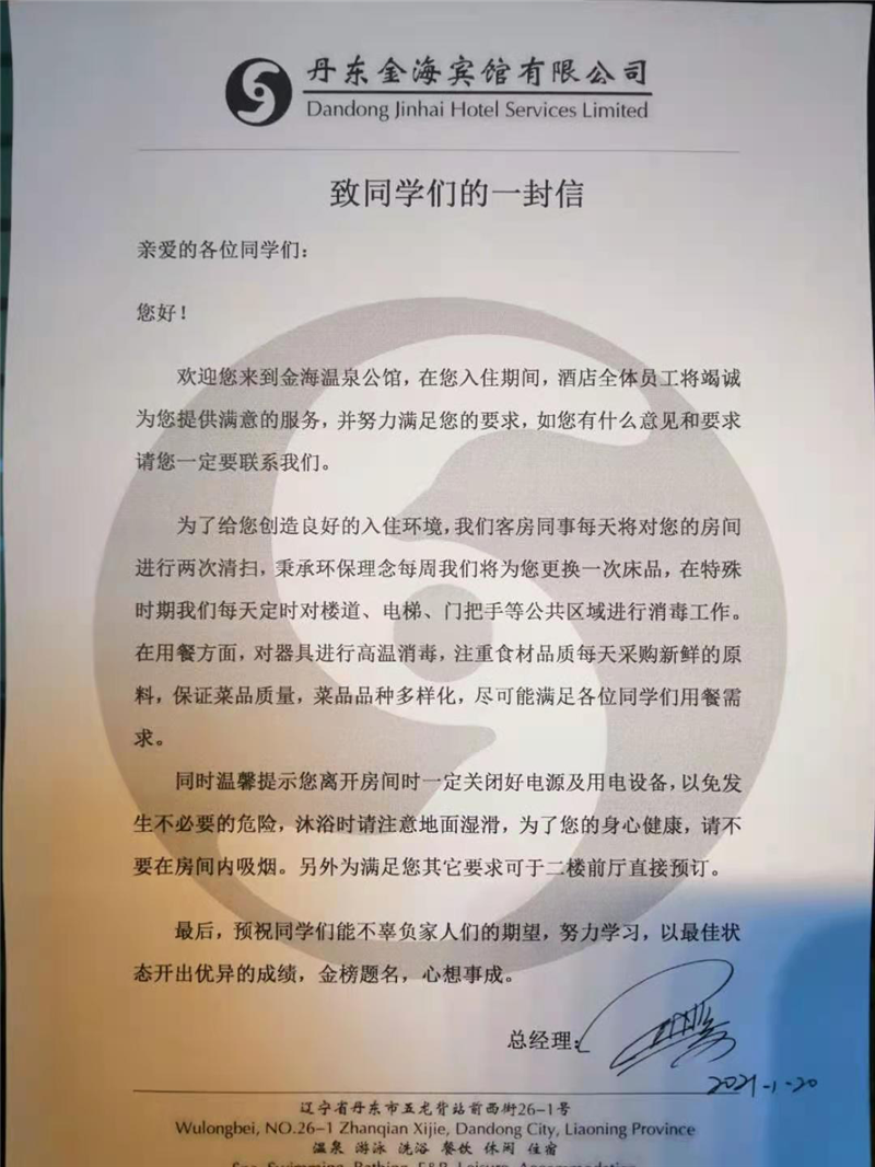 又是一年臨近春節(jié),新冠肺炎疫情再次爆發(fā),給各行各業(yè)造成了不小的沖擊,然爾,金海溫泉公館在這個(gè)特殊時(shí)期卻迎接了一批“特殊客人”——高考學(xué)生。來(lái)了,就是丹東人,要讓住在這里的孩子們感受到丹東人的溫暖,金海人的溫暖,這是金海公館這次重要接待的服務(wù)口號(hào)。