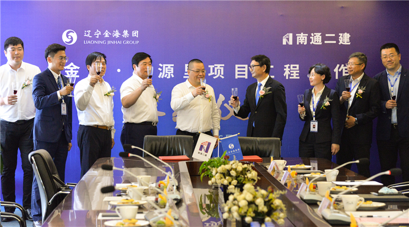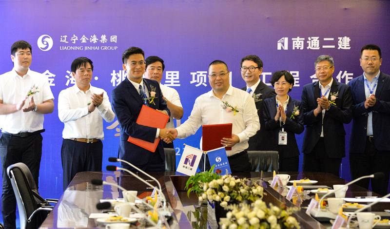 2021年6月15日上午,遼寧金海集團(tuán)與江蘇南通二建集團(tuán)在金海集團(tuán)總部正式簽訂《金?!ぬ以蠢镯?xiàng)目施工總承包協(xié)議》。